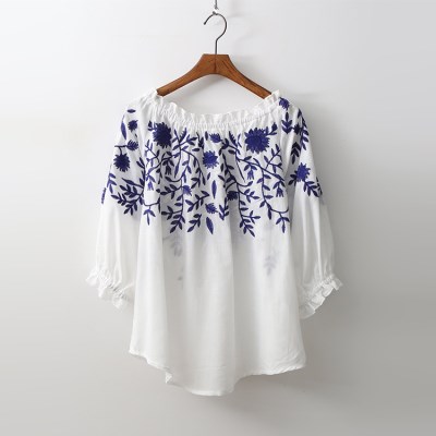 이국적인 자수장식과 어깨가 팔라인이 살짝 오프되는 블라우스.