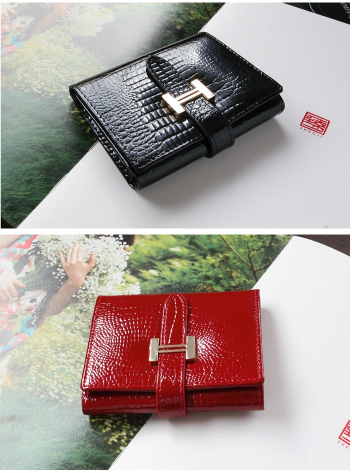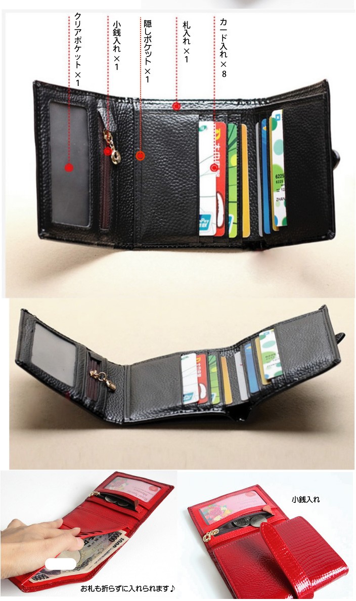 ★カードが9枚入る薄い財布、小さめのバッグにぴったり。★自分使いにもプレゼントにも最適♪ ★カード入れ×9 (免許証等が入れられるクリアポケット一つ)、お札入れ×1、小銭入れが一つ。★クロコダイル柄のエナメル革がゴージャス!。