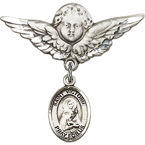 -. Title : Sterling Silver Baby Badge with St. Victoria Charm and Angel w/Wings Badge Pin 1 1/8 X 1 1/8 inches