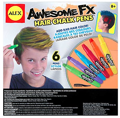 ALEX Toys Craft Awesome FX Hair Chalk Pens lets you express your individuality! Make a statement without saying a word, by wearing vivid colors on your head. Match an outfit, celebrate a holiday or wear the school colors, whatever the occasion, you will stand out. The kit includes 6 washable hair chalk pens (0.2 oz.), comb, style guide and easy instructions. Recommended for children 8 years of age and older.Feature