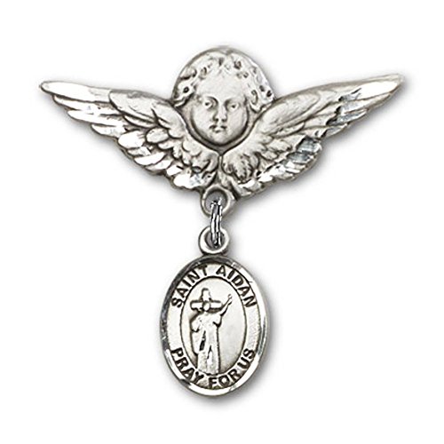 -. Title : Sterling Silver Baby Badge with St. Aidan of Lindesfarne Charm and Angel w/Wings Badge Pin 1 1/8 X 1 1/8 inches