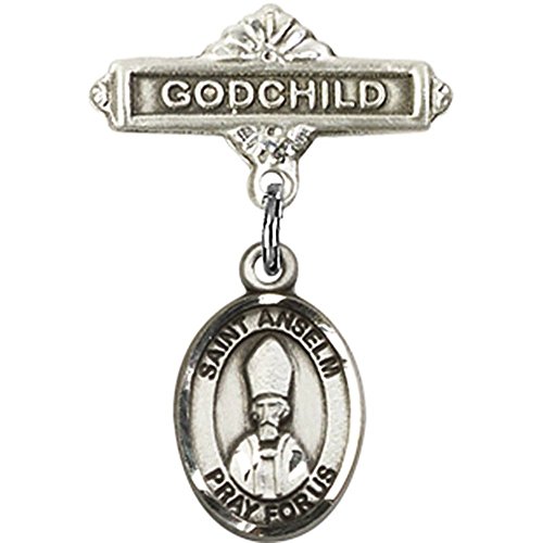 -. Title : Sterling Silver Baby Badge with St. Anselm of Canterbury Charm and Godchild Badge Pin 1 X 5/8 inches