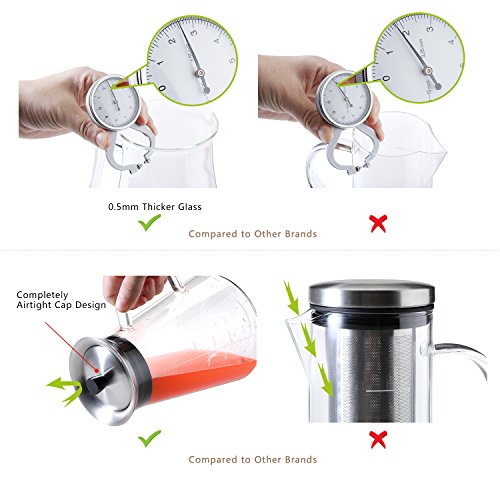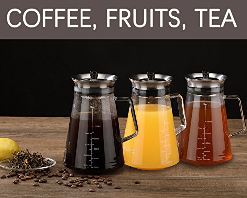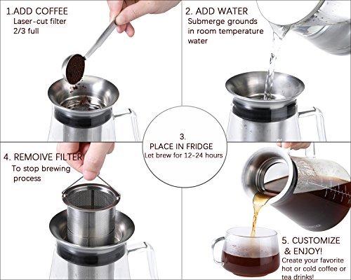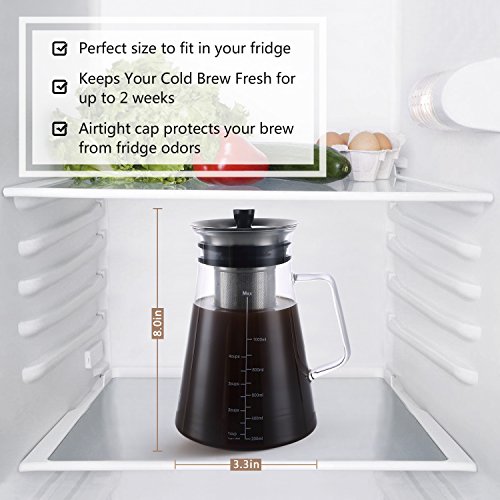 Cold Brew Coffee Maker with Stainless Steel filter - 4 Cups (34oz/1L) Features: ? As necessities of life, cold brew coffee is more and more popular, It's a good choices as a gift. This is the perfect tool to impress your guests at any occasion. ? 100% food-safe parts that contain zero toxins. ? Ideal 4 cups capacity for a whole family to enjoy a good amount of coffee or tea, Saving you more time and more money. ? It is easy to use, easy to clean, stain resistant and odor-free ? Protected And Preserved Flavor, Tight fitting lid secures your cold brew while minimizing exposure to air. Package included: ? Borosilicate Glass carafe (BPA Lead Free) ? Food Grade Safe 18/8 Stainless Steel Infuser and Cap ? User Manual
