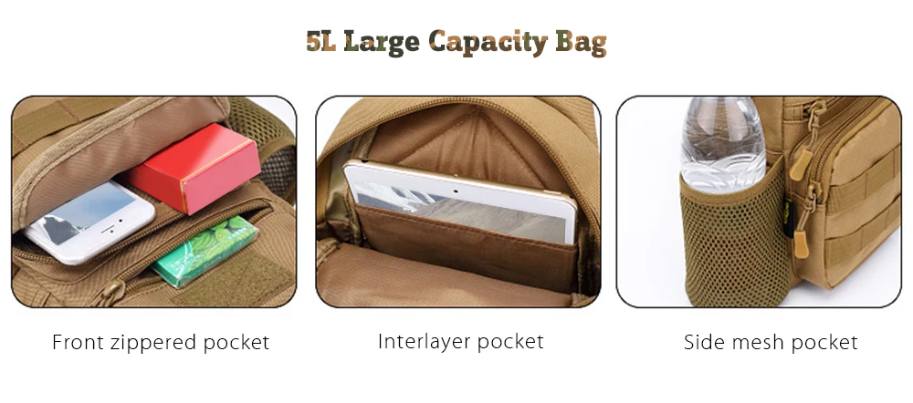 - 5L large capacity with five pouches, one main pocket is able to contain the 550ml water bottle, wallet, etc. One interlayer pocket for storing mini 7.9 inches tablet, one front zippered pocket storing 5.5 inches phone, cards, one top zippered pocket placing lighter, cigarette, paper towel and one side mesh water bottle pouch for storing 550ml beverage, the maximum loading weight is 5kg