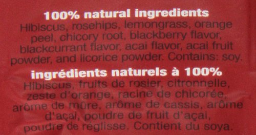 -. Feature : Contains 100 individually foil-wrapped tea bags / Herbal tea combines tarthibiscus flowers with naturalacai berry, blackberry, andblackcurrant flavors / Convenient packaging forfoodservice settings such as restaurants, cafes, self-service and coffee stations / Bulk packaging is great for gift packers,and component product purchasing / Box of 100 tea bags, great bulk size for foodservice or restaurants / Fruity blend combines tart hibiscus with natural acai berry, blackberry, and blackcurrant flavors / Naturally sweet, light and fruity tea can be enjoyed hot or iced / Kof-K Kosher certified, caffeine free, ships in Frustration Free Packaging / Blended in the USA, with natural ingredients from around the world