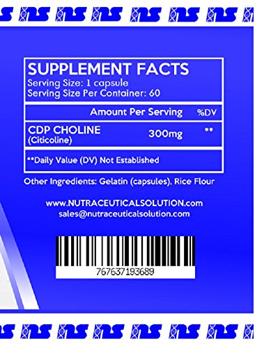 -. Binding : Health and Beauty -. Brand : Nutraceutical Solution -. EAN : 0767637193689 -. Feature : Promotes brain metabolism by enhancing the synthesis of acetyl-choline / Supplements memory and cellular health / CDP-choline dissociates into choline and cytidine, with the cytidine then converting into uridine / CDP-choline is one of the three choline-containing phospholipids that can be orally supplemented / 100% MONEY BACK GUARANTEE -. IsAdultProduct : 0 -. Label : Nutraceutical Solution -. Manufacturer : Nutraceutical Solution -. MPN : NSCPD -. PackageQuantity : 1 -. PartNumber : NSCPD -. ProductGroup : Health and Beauty -. ProductTypeName : HEALTH_PERSONAL_CARE -. Publisher : Nutraceutical Solution -. Studio : Nutraceutical Solution -. Title : CDP CHOLINE (300mg / 60ct) by Nutraceutical Solution - Supports Cerebral Metabolism and Brain Function -. UPC : 767637193689