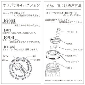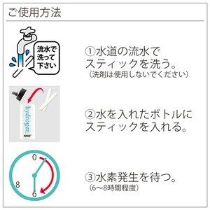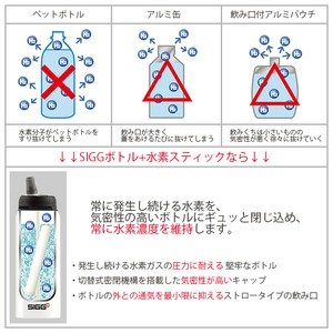 -. Feature : SIGG (シグ)が開発したスパークリング対応の高気密性ボトルは水素が抜けにくく、水素水を高濃度で携帯できます。 SIGGボトルに水素スティック(使用期間1本約6ヶ月)が2本付属。 このセットだけで約1年お使いいただけます。 1日にボトル1本分(600ml)飲んだとしても、①日あたり約30円と超安価で水素水がお楽しみいただけます。 / ①高気密性 ②ストロー吸引方式 ③ガス排出機能 ④分解洗浄 ●飲み物の味を損なわず、臭いが付きにくい特殊コーティング ●分離出来るシリコンマウスピースとカバーキャップ 一口元にやさしいマウスピース。携帯時のカバーキャップをそれぞれ分離洗浄でいつも清潔。 / スティックを1本ボトルに入れると、投入後約2時間で水素が豊富な水素水ができます。 哺乳用お水、炊飯、調理、洗眼、洗髪にもご利用いただけます。 各種試験、認証 ●水道法水質基準合格 ●樹脂製食品容器梱包に関する自主規制基準適合 ●NPO特定非営利活動法人LUDPAC生活習慣病予防学術委員会承認商品 / 使用期間:1本約6カ月 / 水素水スティック生産国:日本 製造元 株式会社ウォーター・インスティチュート ボトル生産国;スイス