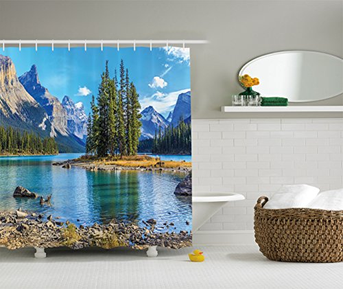 Ambesonne Lakehouse Decor Collection, Scenery of Spirit Island on Maligne Lake Canada in a Summer Time Covered with High Mountains Image, Polyester Fabric Bathroom Shower Curtain, Grey Blue Green
