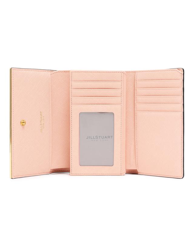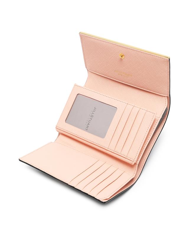 내부 베이비 핑크 배색으로 여성스럽고, 심플한 외관을 보여주며, 하단의 로고와 골드 바장식으로 포인트를 준 3단 중지갑입니다.