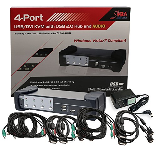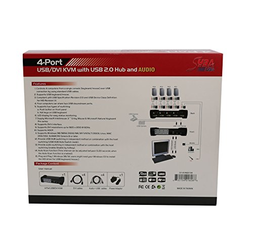 The Syba SY-KVM20108 4 Port VGA and USB 2.0 KVM switch provides a business class KVM that can manage four computers with just one set of keyboard, monitor, mouse, speakers and microphone. Two additional USB ports enable additional peripherals sharing such as printer and thumb drive