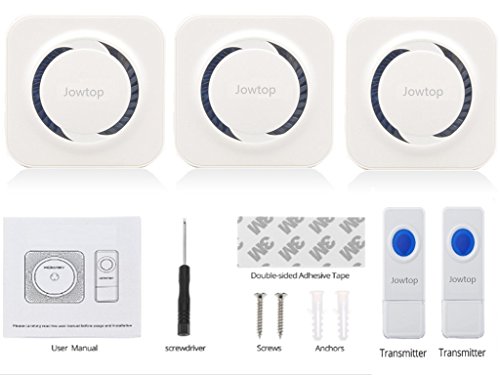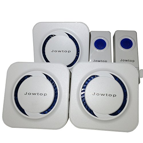Wireless Doorbell with IP44 Waterproof transmitter,52 Chimes,4 Volume Levels with LED Indicator-Over 900 Ft Range-No Battery Needed,2 Transmitter with 3 Receivers (White-Blue Circle)