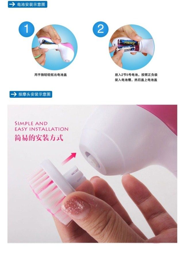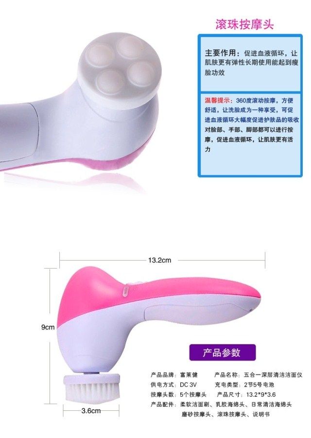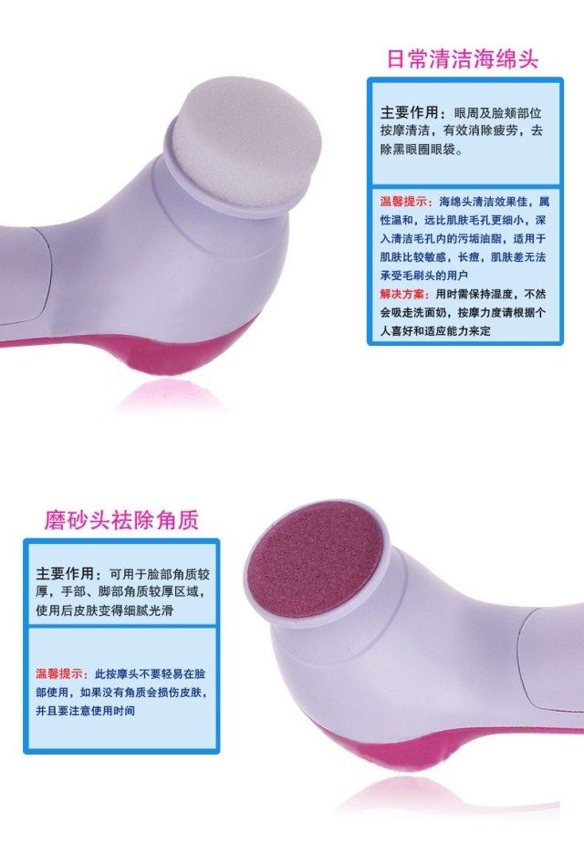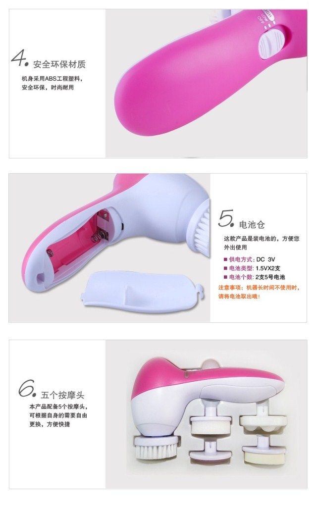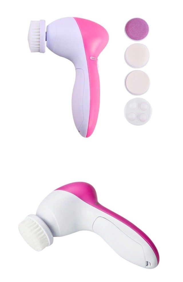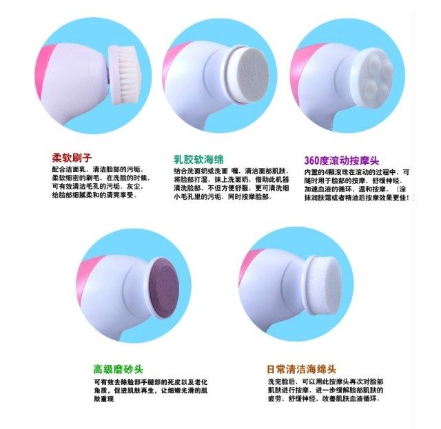 Restore soft and smooth skin Exfoliate dead skin cells to reveal radiant and youthful skin Reduce and erase fine lines & blackheads Compact and light-weight 2 settings: "Low" for daily cleaning, "High" for exfoliation Color: Pinks 5 attachments included: - Soft brush: to clear up all the scurf clings on the surface - Rolling massager: to make better blood circumstances from skin aging - Make_Up sponge: to massage and clean skin . - Latex spomge-soft: Latex Brush for eyes and cheeks - Crude Polish accessory: to rip the tough skin and cutin off