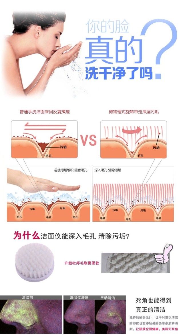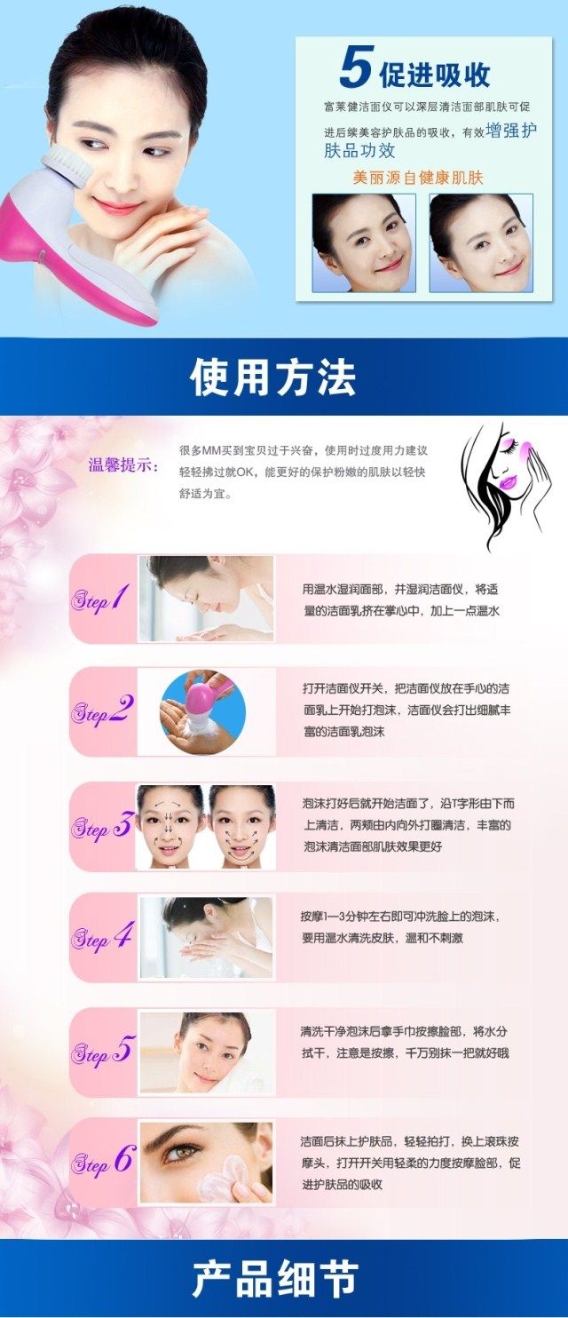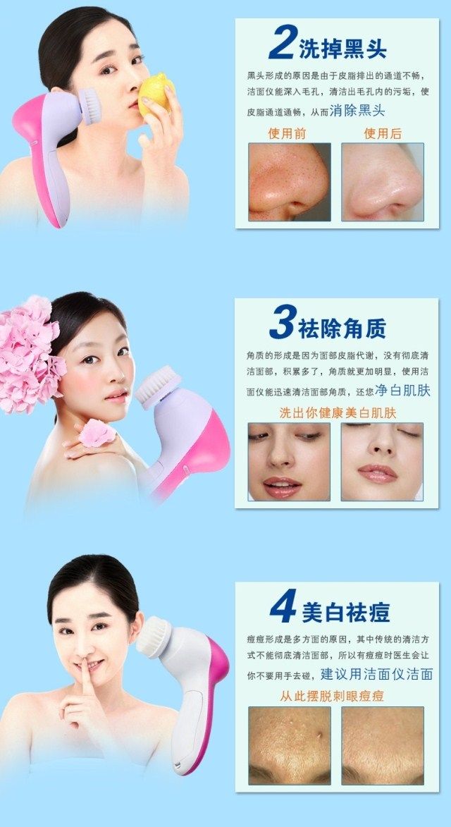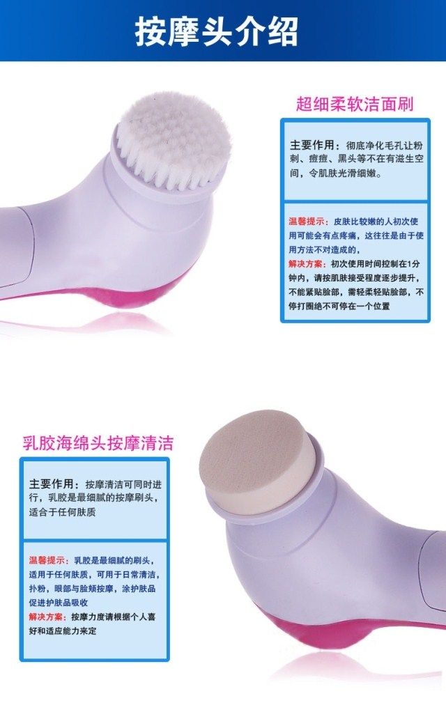 Restore soft and smooth skin Exfoliate dead skin cells to reveal radiant and youthful skin Reduce and erase fine lines & blackheads Compact and light-weight 2 settings: "Low" for daily cleaning, "High" for exfoliation Color: Pinks 5 attachments included: - Soft brush: to clear up all the scurf clings on the surface - Rolling massager: to make better blood circumstances from skin aging - Make_Up sponge: to massage and clean skin . - Latex spomge-soft: Latex Brush for eyes and cheeks - Crude Polish accessory: to rip the tough skin and cutin off
