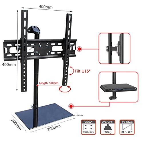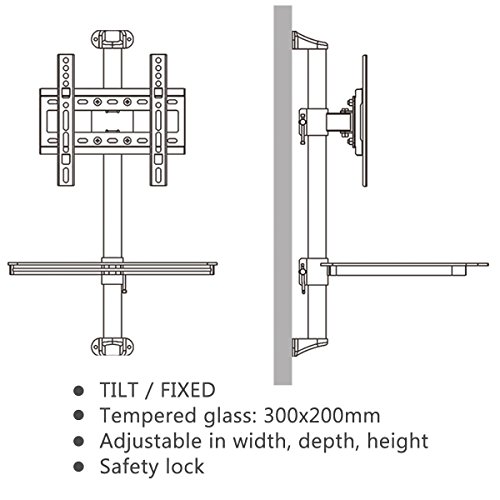 -. Feature : Combination TV wall mount and AV Component Shelf. Universal VESA from 75x75mm(3"x3")to 400x400mm(16"x16"), compatible with most TV brands on the market today / Modern decorative plate and glass shelf (11.8 inch Wide, 7.9 inch deep) is designed to hold DVD players, DVRs, HD recorders, Cable TV Boxes, AV components, gaming systems, for storage of CDs, DVDs and any other media / Height adjustable to locate the TV and your DVD player or gaming console at the ideal height.-15 to +15 degrees tilting, swing left and right from -30 to +30 degrees for optimum viewing angle / Heavy duty shelving system can support up to 55 lbs on TV/monitor bracket and 12 lbs on the wall shelf / Standard mounting hardware and easy to use instructions included. Easy to mount on single stud or concentrate wall