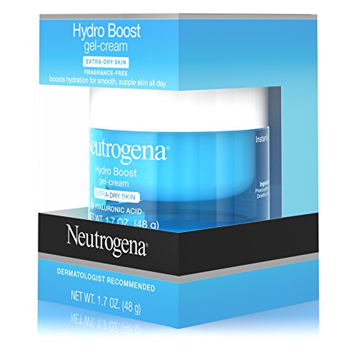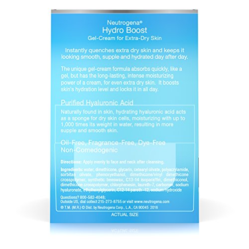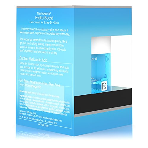 Use Neutrogena Hydro Boost Gel-Cream to instantly quench and provide long-lasting moisture relief for your extra-dry skin. This gel-cream facial moisturizer helps quench extra-dry skin and keeps it looking smooth, supple, and hydrated day after day. The unique gel-cream formula absorbs quickly like a gel, and has the long lasting moisturizing power of a cream. It is formulated with hyaluronic acid, which is naturally found in the skin. Hyaluronic acid acts as a sponge for dry skin cells moisturizing with up to 1,000 times its weight in water, this formla results in more supple, healthy-looking, and smooth looking skin. From a Dermatologist Recommended Brand, this gel-cream is oil-, dye-, and fragrance-free and non-comedogenic. It can be worn alone or under makeup.Feature