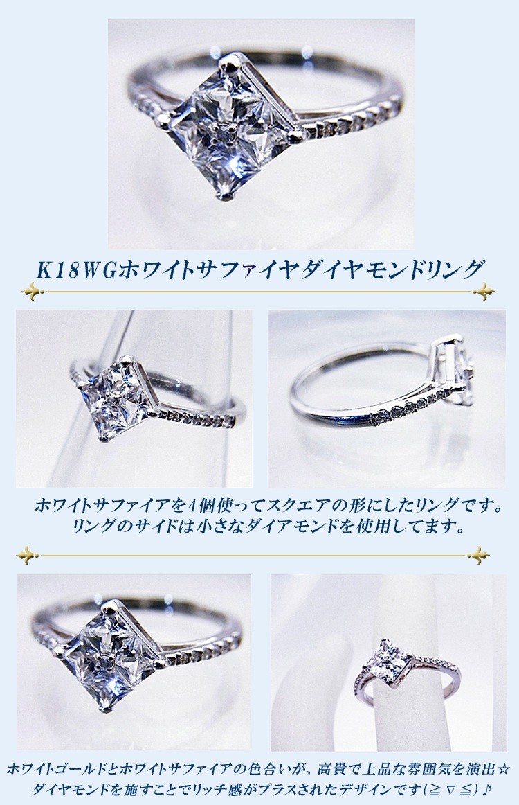 商品説明 ホワイトサファイアを4ピース使ってスクエアをモチーフしたリングです。リングのサイドで天然メレダイヤモンドが輝きを添えています。