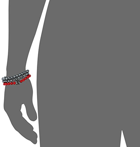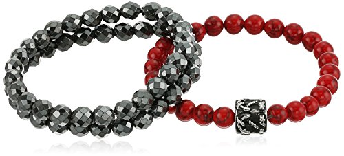 Men's Set of 3 Black and Simulated Coral Beaded Bracelets with Anchor Medallion Bracelet, 8"x 0.3"