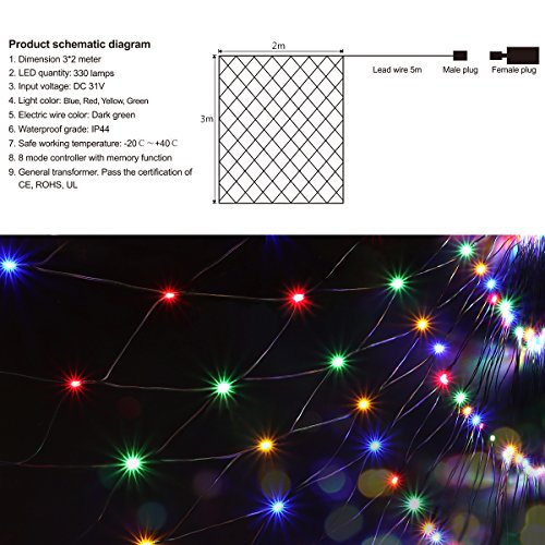 - A DAZZLING NET OF 330 LEDs. Arranged in a net pattern, just enjoy beautiful multicolor lights in a 9.8ft x 6.6ft sheet. Perfect for holidays, weddings, parties, or any other occasion.