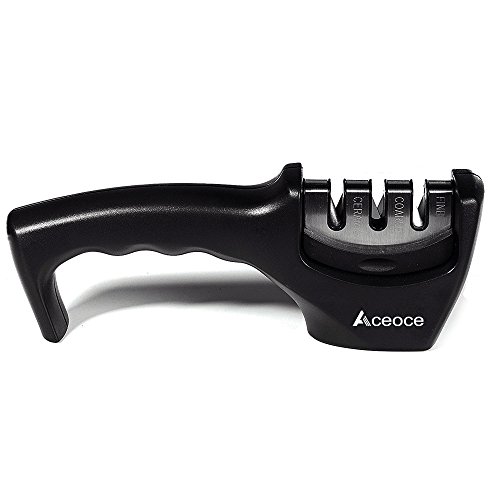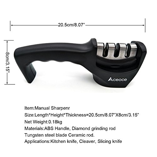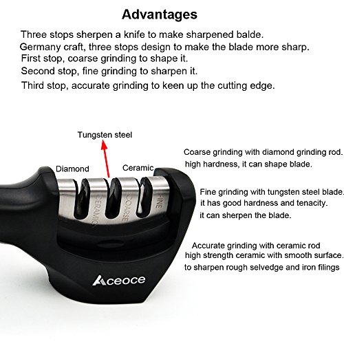 ★3-STAGE DESIGN: Ceramic diamond rod slot for ceramic knives; Coarse tungsten steel blade slot for coarse sharpening; Fine rod slot for finishing and polishing to a precision edge.