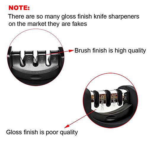 ★EASY TO USE: Simply run your dull steel knife about 3 or 4 times through the "coarse" slot by pulling the knife towards you, and twice through the "fine" slot to remove burrs, and enjoy a perfectly sharpened knife in seconds.