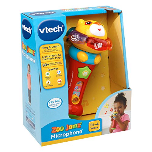 -. Binding : Toy -. Brand : VTech -. EAN : 3417761840009 -. Feature : Sing along to child-friendly songs with the Zoo Jamz Microphone using the colorful voice-amplifying microphone; 80+ songs, melodies, sounds, phrases / Get creative by turning the ring to add fun sound effects or speed up and slow down the tempo / Pressing the six light-up instrument buttons introduces your little one to each instrument and the sound that it makes / Play 10 melodies note by note using the instrument buttons in music; get Zoo Jamz Piano and Zoo Jamz Guitar to collect the whole band, sold separately / Requires 2 AAA batteries (batteries included for demo purposes only; new batteries recommended for regular use); intended for ages 18 months to 4 years -. Label : V Tech -. Manufacturer : V Tech -. Model : 80-184000 -. MPN : 80-184000 -. PackageQuantity : 1 -. PartNumber : 80-184000 -. ProductGroup : Toy -. ProductTypeName : TOYS_AND_GAMES -. Publisher : V Tech -. Studio : V Tech -. Title : VTech Zoo Jamz Microphone -. Warranty : 90 day warranty against manufacturer defects