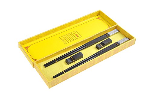 Abacus Asiatica: Elegant red sandalwood chopstick set, with metal "homecoming" decoration (abstract chinese character in geometric pattern), rests and decorative box (2 pairs), Mod. CB-S2-G-M02 (US)