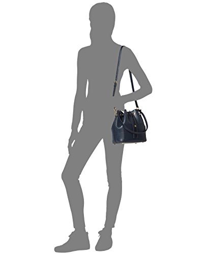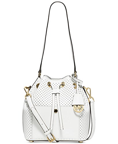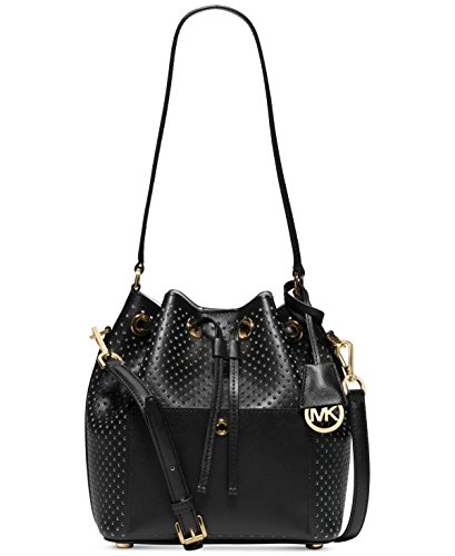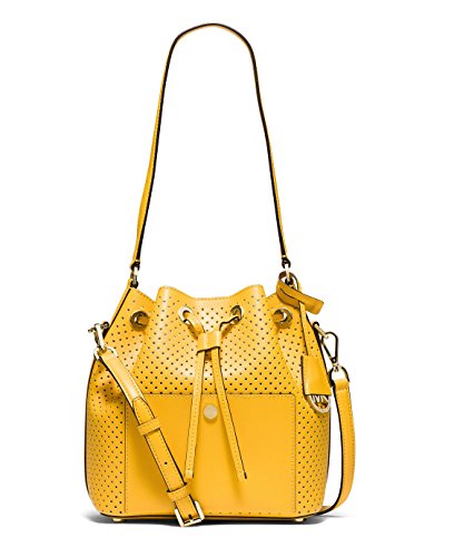 Crafted in this season's must-have bicolor perforated leather, this MICHAEL Michael Kors bucket bag creates an irresistibly luxe look with its cinched shape, spacious interior and simple button accent at front. 11"L single handle; 19"-23"L adjustable long strap Drawstring and magnetic snap closures Exterior features gold-tone (Navy, Sunflower, Optic White, Black) or silver-tone (Dove) hardware Interior features 1 open pocket 10" W x 9-1/4" H x 5-1/4" D Perforated bicolor double Saffiano leatherFeature