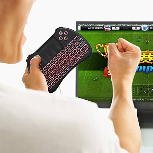 -. Feature : 3 in 1 Multifunction: Mini Wireless QWERTY keyboard, TouchPad, Mouse combo, LED backlit with USB interface adapter. / Backlight function to be used in the dark and at night, you can change the color just press Fn + F2 button, which makes you look more fantastic / High sensitive DPI adjustable touchpad for easy and accurate manipulation, better match the different sizes of screen, you can enjoy more multimedia fun / With the innovative mouse wheel, can facilitate the realization of the mouse wheel functions when you press the Fn button with your finger touch anywhere in the touchpad / Plug and play, no need to install software, with the USB receiver at the back of the keyboard