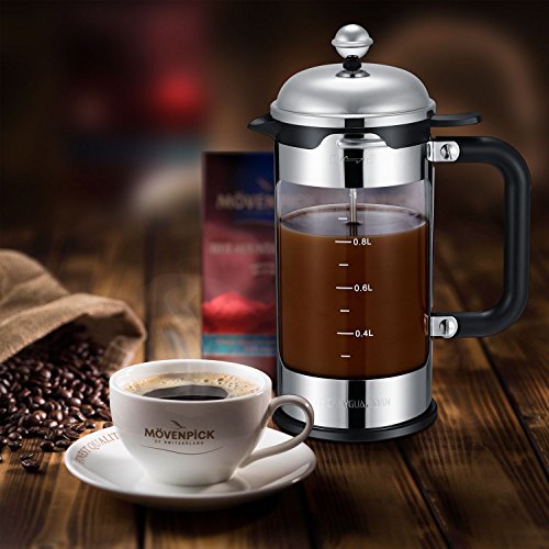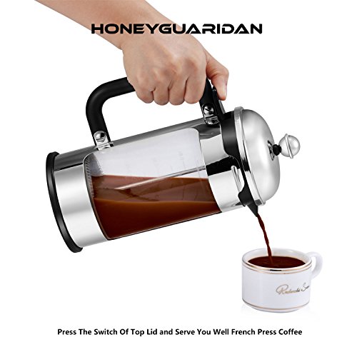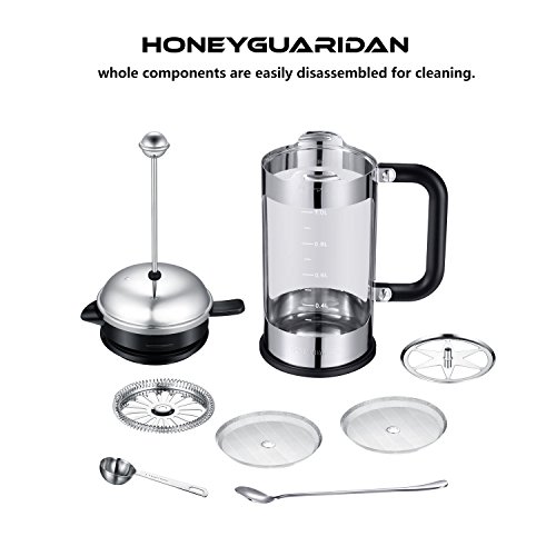 HoneyGuaridan French Press Coffee Maker 8 Cup (1 liter, 34 oz), 4 Level Filtration System, Stainless Steel with Measuring Glass,Free Superior Stainless Steel Measuring Spoon and Mixing Spoon