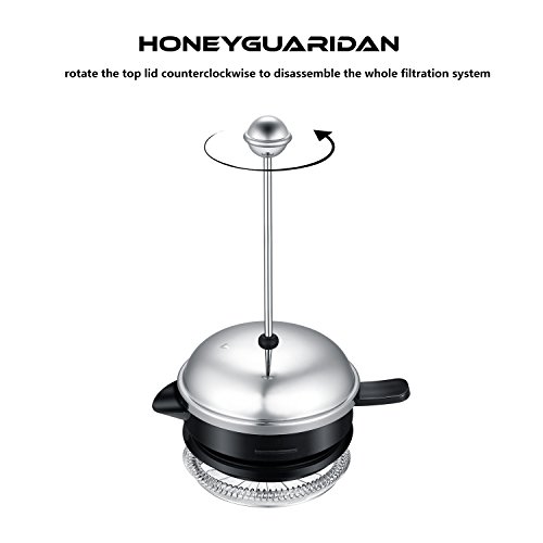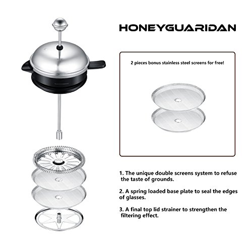 Lifetime Replacement Guarantee - One Month refund without any reasons. If anything happens to your original HoneyGuardian french press coffee maker, we will replace it for free. Package contains :Stainless Steel French Press with measuring glass and double stainless steel screen filters, a Stainless Steel measuring spoon, a Stainless Steel mixing spoon, and User Manual