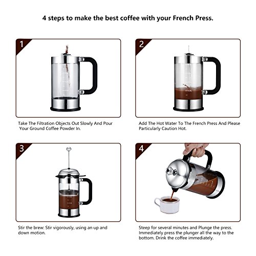 Compact Design made with Superior Materials: All metal parts of the french press are made of 304 grade stainless steel. The large carafe is made of thick borosilicate glass, which can withstand boiling water. Even you change it from 212℉ to 32℉(100 °C - 0 °C), it still works well. It is easy to pack for outdoor activities.