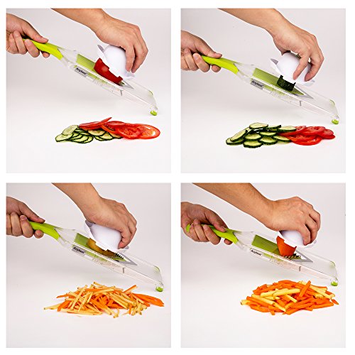 - Feature : Get perfect, even slices of carrots, onions, zucchini, tomatoes, kiwi and apples / Flip the knob to pop up the julienne blades and cut zucchini for stir-fry or carrots for garnish / Sliding button adjusts between 3 thicknesses: thin, medium and thick / Non-skid base and ridges keep mandoline slicer stable on cutting surface and allow for use over a bowl / Dishwasher safe, hand wash for best results