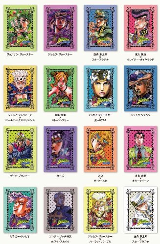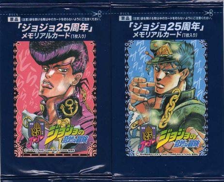 江崎グリコのキャンペーン「ジョジョ25周年メモリアルカード」、全40種+アナザーverセットです。セット内容: ジョナサン・ジョースター、ジョセフ・ジョースター、空条承太郎×スタープラチナ(2種)、東方仗助×クレイジー・ダイヤモンド(2種)、ジョルノ・ジョバァーナ×ゴールド・エクスペリエンス、空条徐倫×ストーン・フリー、ジョニィ・ジョースター&爪・act4、ジャイロ・ツェペリ、ディオ・ブランドー、カーズ、DIO×ザ・ワールド、吉良吉影×キラークイーン、ビネガー・ドッピオ、エンリコ・プッチ神父×ホワイトスネイク、ジョセフ・ジョースター×ハーミットパープル、空条承太郎×スタープラチナ(4部ver)、 ロバート・E・O・スピードワゴン、ウィル・A・ツェペリ、エリナ・ペンドルトン、石仮面、 リサリサ、シーザー・アントニオ・ツェペリ、ワムウ、エシディシ、 ジャン=ピエール・ポルナレフ×シルバー・チャリオッツ、花京院典明×ハイエロファント・グリーン、モハメド・アヴドゥル×マジシャンズ・レッド、イギー×ザ・フール、 虹村億泰×ザ・ハンド、広瀬康一×エコーズACT3、岸辺露伴×ヘブンズ・ドアー、山岸由花子×ラブ・デラックス、 ブローノ・ブチャラティ×スティッキィ・フィンガーズ、トリッシュ・ウナ×スパイス・ガール、グイード・ミスタ×セックス・ピストルズ、ジョルノ・ジョバァーナ×ゴールド・エクスペリエンス・レクイエム、 ウェザー・リポート×ウェザー・リポート、エルメェス・コステロ×キッス、ナルシソ・アナスイ×ダイバーダウン、エンポリオ・アルニーニョ×バーニング・ダウン・ザ・ハウス、