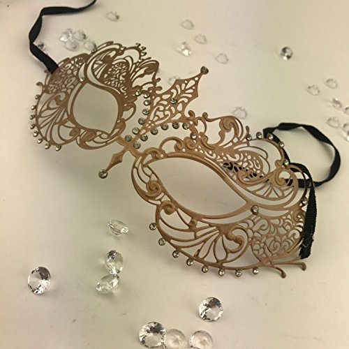 This laser cut metal mask is a great addition to any Halloween costume, masquerade party, or prom embellished with rhinestones, this mask can be gently bent to form to your face. This mask ties in the back with two soft matching ribbons. Measures approximately Measures: 7.5" Length x 3" Wide, one size fits most.Feature