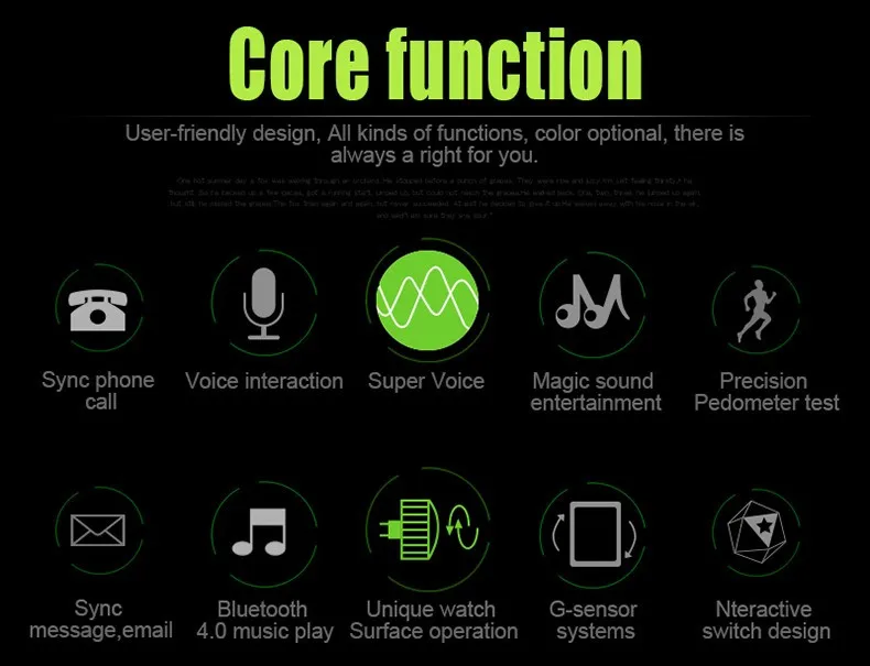 - Function:Answer Call,Passometer,Message Reminder,Sleep Tracker,Remote Control,Dial Call,Call Reminder,Fitness Tracker,Push Message