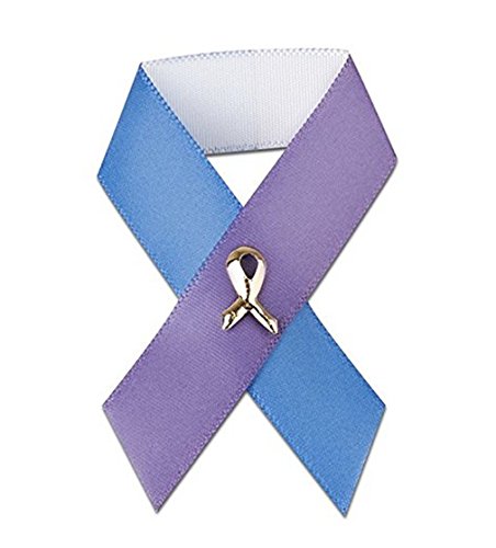 Product Description This satin blue and purple ribbon pin is approximately 3 inches tall by 2 inches wide and has a small gold tac pin in the middle that holds the ribbon together. You get 3 brand new pins. 0