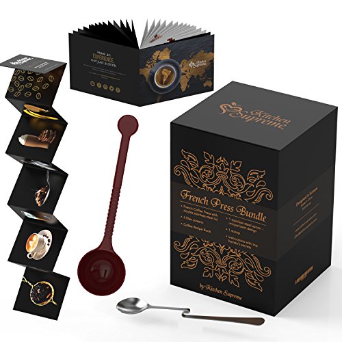 NEWEST Design! SUPERIOR French Press Bundle: The Coffee, Espresso and Tea Maker 1 Litter (about 8 small coffee cups or 4 coffee mugs) + 1 unique SPOON made from thick stainless steel + 4 FILTER screens (The only Coffee Maker with 4 Screens System for no more grounds in your coffee) + 1 Coffee/Tea SCOOP + HARD COPY Instruction Book and Barista's Recipes. CONFIDENCE: 5 YEARS WARRANTY
