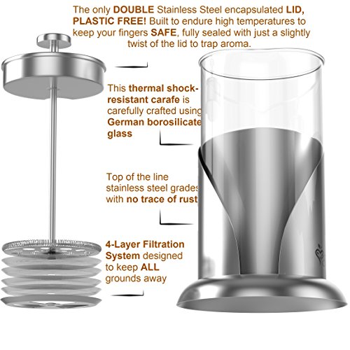 The only French Press with DOUBLE Stainless Steel encapsulated LID, PLASTIC FREE! Built to endure high temperatures to keep your fingers SAFE, fully sealed with just a slight twist of the lid to trap aroma. Carefully crafted using unbreakable GLASS, the thermal shock-resistant carafe is MADE IN GERMANY! 4 FILTER SCREENS for all types of coffee grounds - The French Coffee Press can be used as a Tea Infuser using the unique Stainless Steel Plunger System.