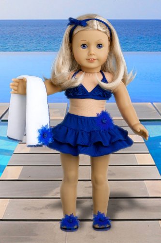 This stylish navy blue 4 piece bikini outfit includes skirt with a sewed in panties, flip flops and beach blanket decorated with the same flower as the shoes and skirt.