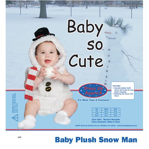 -. Binding : Apparel -. Brand : Dress Up America -. Color : White -. Department : baby-girls -. Feature : Product comes complete with, bubble outfit with attached hat / Outfit closes with snaps for easy diaper, changing hat closes with velcro / Set packaged in durable snap-sealed poly bag -. Genre : Holiday - Christmas -. Label : Dress Up America -. Manufacturer : Dress Up America -. Model : 361 -. MPN : 361-0-6 -. NumberOfItems : 1 -. PackageQuantity : 1 -. PartNumber : 361-0-6 -. ProductGroup : Apparel -. ProductTypeName : BABY_COSTUME -. Publisher : Dress Up America -. Size : 0-6 Months -. Studio : Dress Up America -. Title : Dress Up America Baby Snow Man