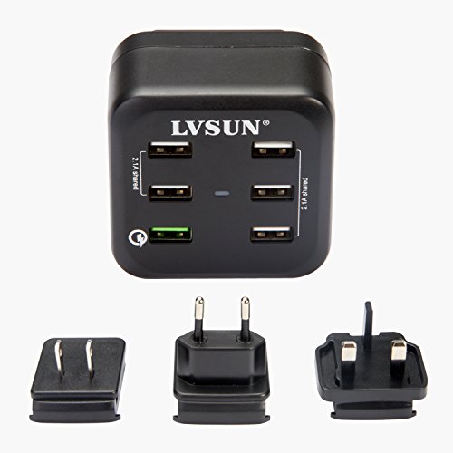 -. Feature : Qualcomm quick charge 2.0 allows compatible devices to charge 75% faster / Smart charging technology, recognizes the electronic device and maximizes charging efficiency, charge faster and save time / Built in multi-protections, surge protection, temperature control and more advanced safety features keep you and your devices safe / Blue LED indicator confirms whether USB charger is properly connected / 12 month warranty, package includes: 6-port USB wall charger, three interchangeable AC plugs US,EU and UK, stable packing