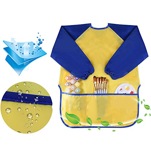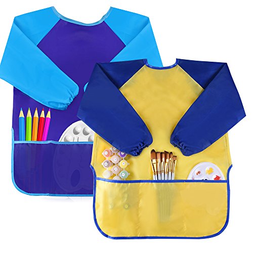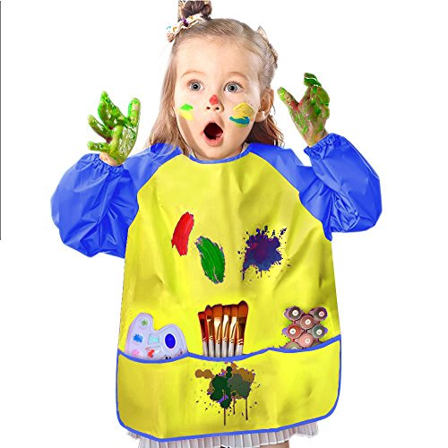 - Popular design has long sleeves for best protection and the adjustable velcro closure design for convenient use. Besides, the 3 front pockets helps children to hold water pen, paint, snacks and paper towels and other items.