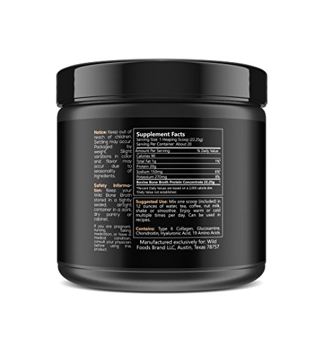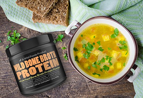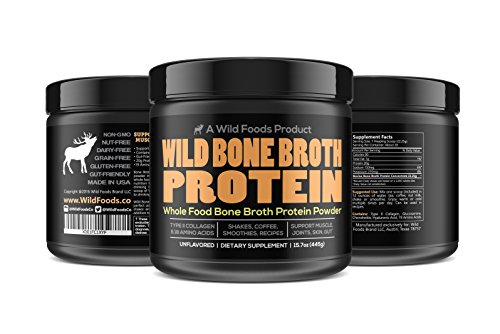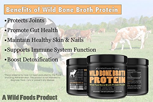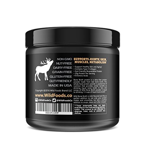 -. Feature : Bone Broth protein is a dairy-free, whole food protein powder made from real bovine bone broth from grass-fed, 100% pastured cattle (No Hormones). It is packed full of nutrition and provides similar benefits as drinking liquid bone broth. / Bioavailable Protein, Gut-Friendly, Paleo-Friendly, Non-GMO, Dairy-Free, Grain-Free, Gluten-Free, Made in USA / Contains: Type II Collagen, Glucosamine, Chondroitin, Hyaluronic Acid, 19 Amino Acids. / Wild Bone Broth is mild-flavored and thus a perfect addition to not only your protein shakes and smoothies, but also a perfect addition to soups, stews and other recipes! / Use code WILDSAVE when you Buy 2, 3, 4, 5, 6, 7 or more products and receive a higher discount for each tier! Mix and match any Wild Foods products! Enter code WILDSAVE at checkout. 100% MONEY-BACK GUARANTEE in the unlikely event you are not fully satisfied.