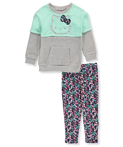 A retro layered look and cool glittery print give this Hello Kitty 2-piece a fashion upgrade. Hello Kitty 2-piece outfit Fleece sweatshirt with layered contrast bodice, slider sleeves, kangaroo pocket, embroidered design, contrast rib-knit trim, and glittery graphic (52% cotton, 48% polyester) Stretch jersey leggings with logo graphic and elastic waistband (60% cotton, 36% polyester, 4% spandex) Machine wash cold, gentle, inside out ImportedFeature