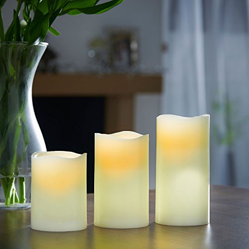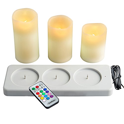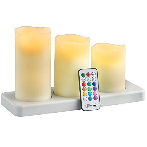 VonHaus Rechargeable Electric Candles – Set of 3 x Battery Operated Flameless LED Real Wax Pillars with 12 Colors, Flickering Mode, Remote Control & Timer (Ivory Color)