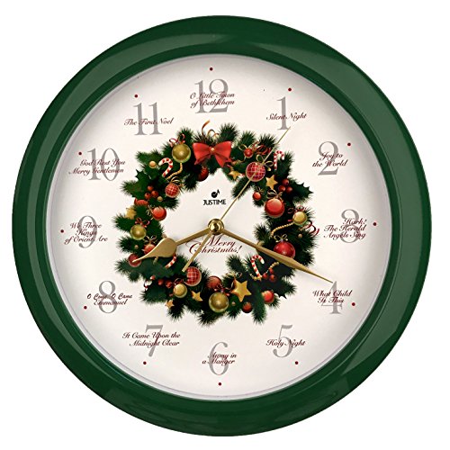 Binding : Kitchen Product Description A Christmas carol wall clock features unique illustrated wreath dial with Christmas tone casing. Glass protects the white dial, soft grey Arabic numerals with the names of the melodies printed in red at each hour location. The spade hour hand and diamond minute hand are gold-finished. A beautiful addition to your mantel or wall during the holidays! As the hour hand moves from hour to hour, you'll hear 30 seconds of one of your favorite Christmas carols. It will be an excellent season gift option. Quartz Taiwan sweep silent movement, 3 AA Batteries operated not included. Automatic nighttime chime shut-off feature, Dimension: Dia. 14" (36cm) D:2" (5cm) These carols featured at the hour: (1)Silent Night, (2)Joy to the World, (3)Hark! The Herald Angels Sing, (4) What Child Is This, (5)O Holy Night, (6)Away in a Manger, (7)It Came Upon the Midnight Clear, (8)O Come, O Come Emmanuel, (9)We Three Kings of Orient Are, (10)God Rest You Merry Gentlemen, (11)The First Noel, (12)O Little Town of Bethlehem 0