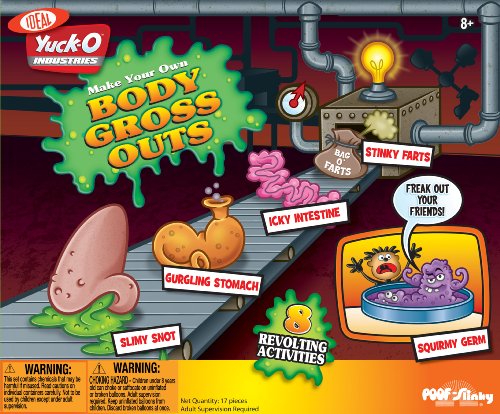 -. Binding : Toy -. Brand : Ideal -. EAN : 0071547300120 -. Feature : Awesomely gross fun that will truly gross out your family and friends / Includes 8-activites that features "Growing Funky Creatures", "What Goes In Must Come Out", "Blood and Guts", "Getting Gassy" and more / Learn a little science by mixing up a batch of icky, sticky fake blood and making a stinky intestine / Safe and fun kit will have you working on activities that look and smell so real your friends and family might want to barf / Recommended for children 8-years of age and older with adult supervision -. Label : Ideal -. Manufacturer : Ideal -. Model : 30012 -. MPN : 30012 -. NumberOfItems : 1 -. PackageQuantity : 1 -. PartNumber : 30012 -. ProductGroup : Toy -. ProductTypeName : TOYS_AND_GAMES -. PublicationDate : 0100 -. Publisher : Ideal -. Studio : Ideal -. Title : Ideal Yuck-O Industries Make Your Own Body Gross Outs Kit -. UPC : 071547300120 -. Warranty : No Warranty