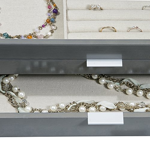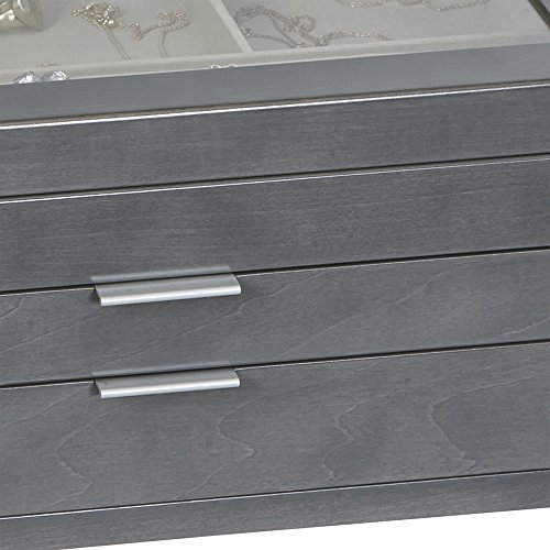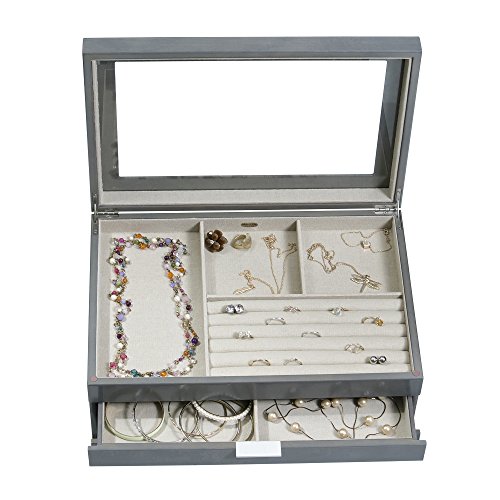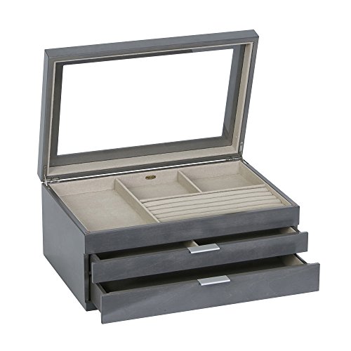 -. Binding : Kitchen -. Brand : Mele & Co. -. Feature : Dimensions: 15L x 10W x 6.5H in. / Crafted of gray-finished wood / Includes 3 tiers / Linen-weave lining / Features large ring-roll section -. Label : Mele Jewel Box -. Manufacturer : Mele Jewel Box -. MPN : 00340S17 -. PackageQuantity : 1 -. PartNumber : 00340S17 -. ProductGroup : Home -. ProductTypeName : HOME -. Publisher : Mele Jewel Box -. Studio : Mele Jewel Box -. Title : Misty Glass Top Wooden Jewelry Box - 15L x 10W in.