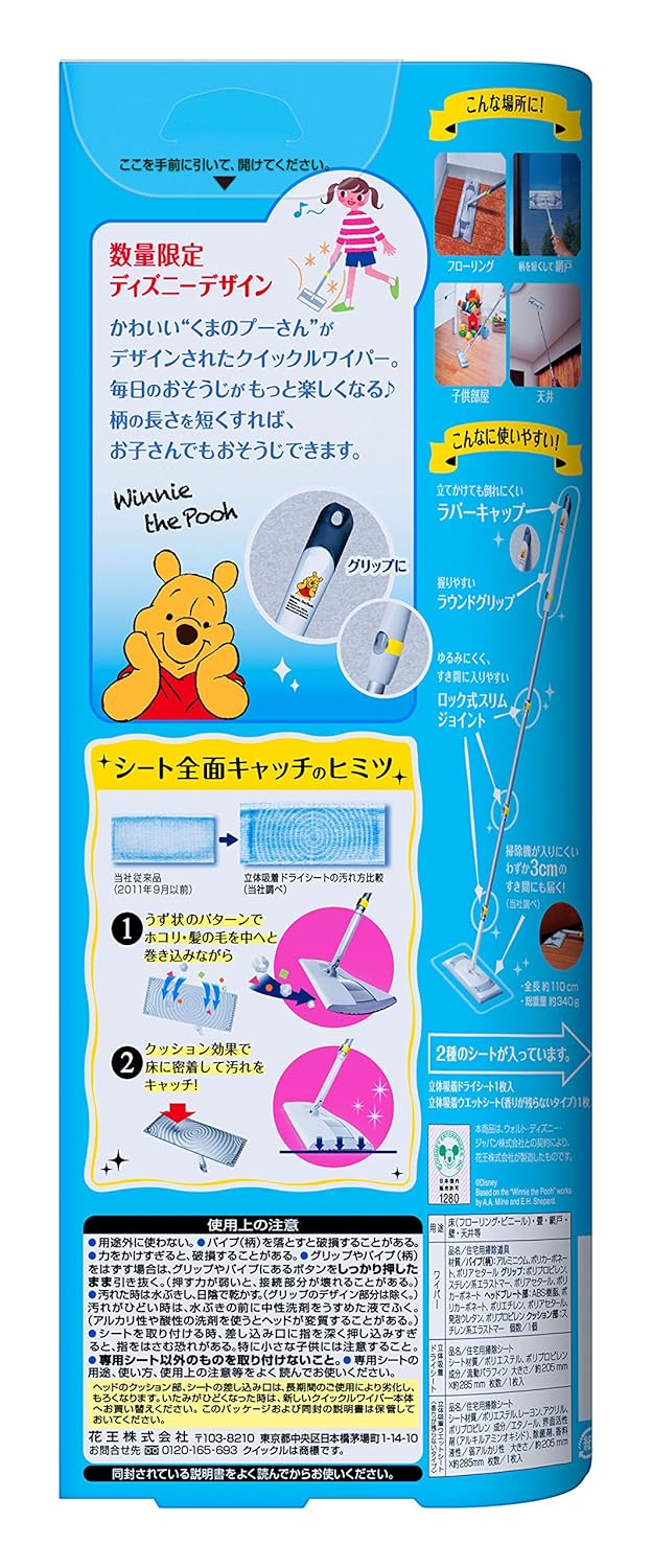 商品サイズ (幅×奥行×高さ) :100×65×285内容量:1組クッションヘッドが、床面にしっかりフィットして、シート全面でホコリ・髪の毛をたっぷり捕集します。クマのプーさんがデザインされたワイパー。毎日のお掃除がもっと楽しくなる♪柄の長さを短くすればお子様でもお掃除ができます。