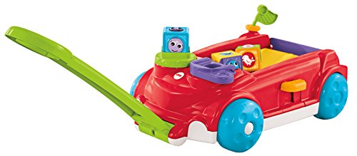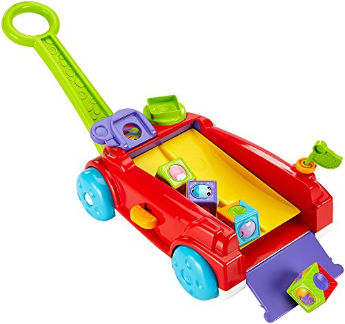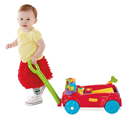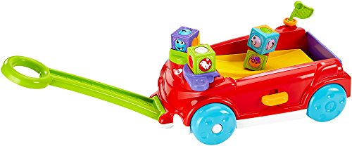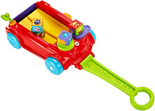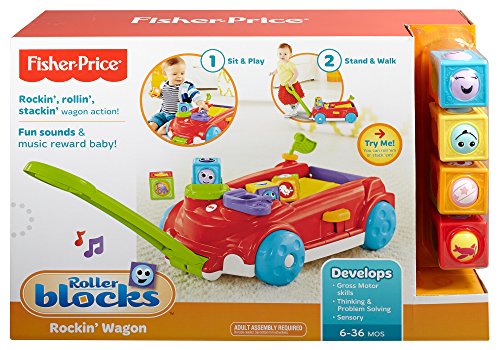 The Fisher-Price Roller Blocks Rockin' Wagon gives baby 2 ways to play! Entertain the youngest babies in Sit & Play mode with a clicker wheel to stack the roller blocks, a peek-a-boo flipper to flip blocks onto the wagon's rockin' ramp, and flag with noisy clacker bead. Mom can keep the tailgate up to contain the play for the littlest ones. When baby's crawling and on the move, mom can flip the tailgate down so the blocks race out the back for baby to chase! And by pressing the lever, baby is rewarded with teeter-totter action, music and silly sounds! When baby's ready for Stand & Pull mode, simply unfold the handle from underneath. With fun music that plays and blocks that teeter-totter back and forth on the ramp when the wagon's pulled along, baby will be encouraged to walk! This wagon's definitely rockin' with non-stop fun and roller block racin' action!Feature